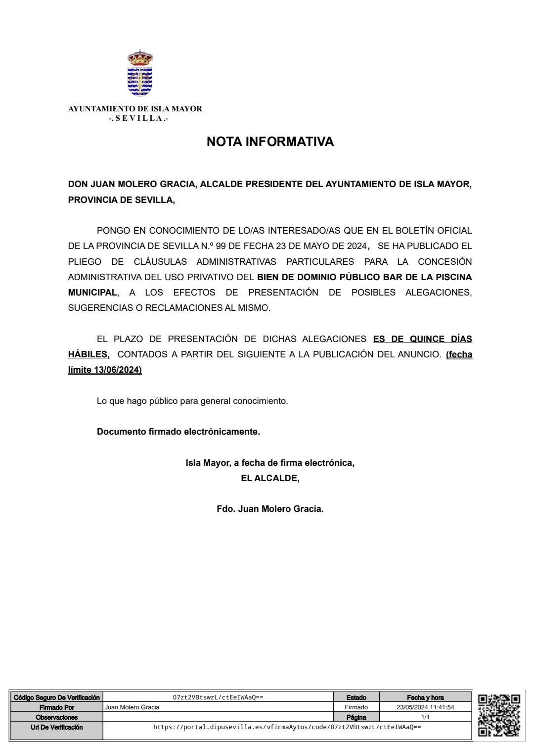 CONCESIÓN ADMINISTRATIVA DEL USO PRIVATIVO DEL BIEN DE DOMINIO PÚBLICO DEL BAR DE LA PISCINA MUNICIPAL.